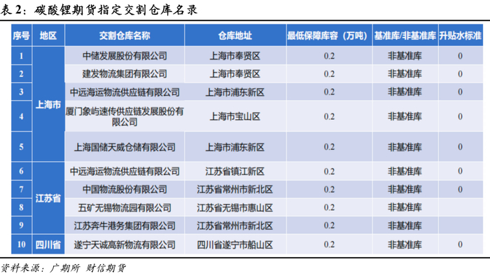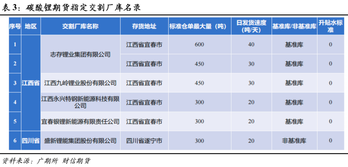 交割区域主要设置在碳酸锂的主产区和主销区,以江西为基准交割区域。交割仓库和厂库也覆盖了主要的产区和销区,目前交割仓库最低库容共2万吨,厂库出库量约0.24万吨。交易所表示后续将积极推进第二批交割仓库和厂库的注册工作,适时公布第二批交割仓库及厂库名单,充分满足大家的交割需求。