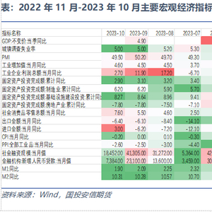 过去的一段时间内,全球宏观经济运行有以下特征:首先,金融条件的持续紧缩得到了美国政策制定者的反馈,随着9月议息会议后美债被抛售的压力进一步抬升,美国财政部调整了后续的发债节奏和结构;同时美联储11月份继续暂停加息后,市场开始交易本轮加息周期的结束以及降息的时点有所提前,全球的金融条件得到了协同式的修复;第二,国内的外部流动性的约束有所缓解,同时财政政策继续发力。APEC旧金山会议中美领导人的会晤,释放了对于金融和经贸合作层面相对积极的信号,与此同时国内在对内的经济政策上也继续积极推进,一方面增发国债继续推动财政化债,另一方面也加大对于地产金融的支持力度;第三,增长景气度经过三季度的修复后,进入到四季度略有回落,国内的地产基本面修复仍然弱势。由于上游能源价格的调整,中下游的利润率有一定的修复。