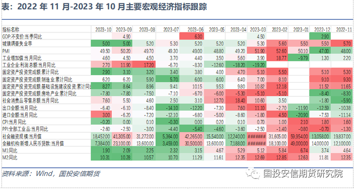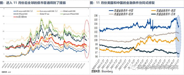 未来或从以下几个方面把握宏观上的主要矛盾:第一,关注巴以局势是否延续降温并继续向停火的方向发展。围绕着中美关系的边际改善,中东的局势亦有所缓和,如果这一趋势继续延续的话,那么能源价格预计会维持在相对弱势的状态,中美短期的输入性通胀的压力会有所缓解,12月份的FOMC会议则不会对于经济和市场产生较大冲击,11月份以来形成的金融条件修复的有利局面在12月份或有一定的维持; 第二,关注国内的房地产金融条件修复的延续性。回顾整个11月份,全球债市普涨,国内的地产债亦有明显的修复,政策支持下,市场定价地产债从违约压力大增到兑付风险降低,有利于对于国内金融风险担忧的缓解,不过在经济淡季其向实体层面的传导效果或难以迅速显现,地产基本面给实体经济的景气度带来的压力或仍有反复,关注政策的延续性以及传导机制;第三,关注国内市场流动性环境改善的机制能否启动。9-10月份,在汇率压力和财政发债压力下,国内出现了显著的资金面的紧张,对于金融市场带来一定的压力,随着人民币汇率压力的缓解,压力有所缓解,债市首先收益,而股市资金面的改善尚不强势,市场对于年底实体层面资金链的紧张仍有担忧,另外虽然人民币汇率偏强,但是北上资金的流入并不强势,后续关注国内流动性环境能否出现修复。