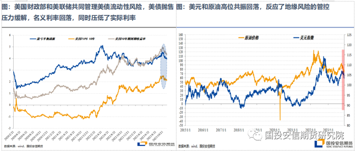 对于大类资产的运行而言,呈现了两方面的特征:首先,人民币走强的背景下,国内的金融品受到一定的提振,国债的流动性压力有一定缓解,同时地产债呈现出明显的反弹,股指筑底更进一步,股市呈现出中小市值偏强的结构性行情特征;第二,大宗商品呈现出结构再平衡的特征,供给压力有所缓解下原油价格回落,同时国内财政政策发力下对于黑色板块提供了较强的预期支撑,另外贵金属在美国实际利率的回落下表现偏强。