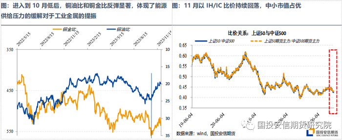 股指:海外方面最近一个多月经历了长端美债收益率快速抬升到回落的过程,12月议息会议前后在美联储和美财政部的共同作用下,美债收益率或更多呈现一种上有顶,下有底的状态。11月中美元首旧金山会晤达成20多项共识,同意推动和加强中美各领域对话合作。在中美经贸关系边际向好,美国货币边际转鸽以及国内财政政策继续发力的背景下,中期有望促进A股市场风险偏好修复延续。近期美元以弱势震荡为主,原油亦处于承压的状态,地缘风险的管控延续推进,因此全球权益资产运行的基础环境较好,持续反弹后关注后续动力问题。国内方面市场较为关注接下来政策对于地产金融的修复的支持力度,以及地产金融条件缓解的实际情况。国内流动性从短端国债收益率近期的快速上行来看难现宽松,市场存量资金博弈下,国内股指更多的聚焦在中小盘和微盘因子层面的结构性行情之上。后续继续跟踪国内积极政策的脉络,关注行情轮动的机制。