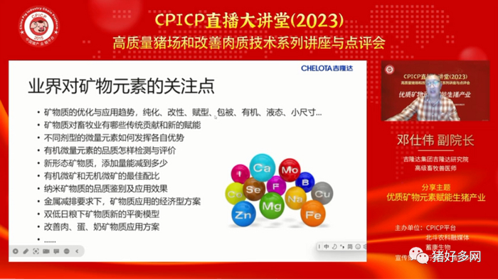 基于此,2023年11月22日,CPICP、北斗农科融媒体、蓄康生物、猪好多网联合在CPICP大讲堂举办了高质量猪场和肉质改良技术系列讲座与点评会,特邀吉隆达集团吉隆达研究院高级畜牧兽医师邓仕伟副院长《优质矿物元素赋能生猪产业》的专题分享,邓仕伟副院长全面详解优质矿物元素改善饲料、优质矿物元素改善动物、优质矿物元素改善动物消费品,本篇带您回顾邓仕伟副院长的精彩观点。