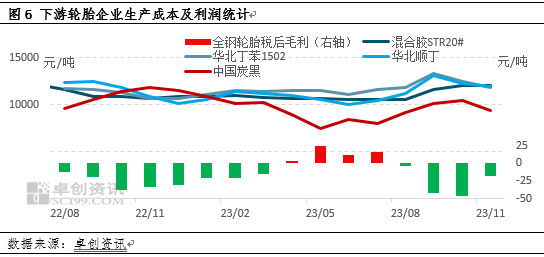 从下游轮胎企业利润情况来看,以全钢轮胎为例,主要由橡胶、炭黑、助剂以及钢帘线等主要原材料构成,其中橡胶的重量占比达到近一半,其次是炭黑、钢丝线等。从卓创资讯监测的主要原材料价格变化情况来看,今年1-6月轮胎主要原材料价格均呈现不同幅度的下滑,其中用胶量最大的天然橡胶价格下滑幅度超15%。主要原材料价格下滑明显,缓解轮胎生产成本压力。而在国内整体经济形势的稳步向好,轮胎销售环境得以改善,国内需求缓慢回升以及海外需求的较强带动,轮胎行业复苏明显,尤其出口市场表现强劲。在承恩压力缓解,销售订单改善背景下,企业利润得到向好修复。然8月以后,伴随着轮胎原料的普涨局面,下游加工利润被压缩,直至持续亏损局面,尤其10月份轮胎生产利润为-46元/吨水平,创近三年最大亏损幅度。虽然年底原料高位走弱,亏损局面收窄,但由于季节性销售淡季以及成品累库,企业减产停产增多,下游开工承压下行。