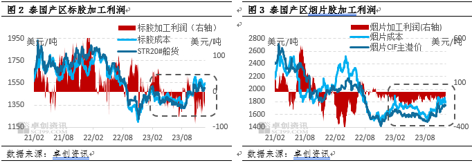 从企业加工利润来看,自新胶开割以来,泰国生产企业加工利润由于原料收购价格的持续高挺而被不断挤压,标胶生产加工利润处于持续亏损当中,外盘商低价出货意愿不高;且同时汇率波动影响进口成本,内外盘持续倒挂,从而导致美金市场船货成交持续寡淡,部分大型工厂船期订单延后。从下面图中可以看出,无论是泰国STR20#标胶还是RSS3#生产加工均缺乏利润空间,尤其是烟片胶年内基本处于持续性亏损。