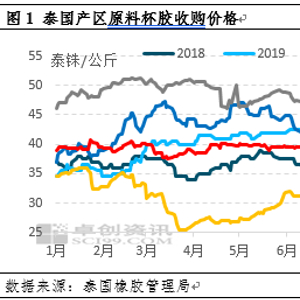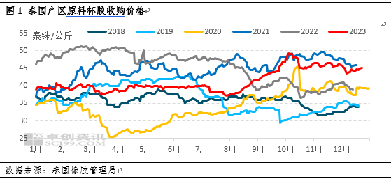由于今年厄尔尼诺气候影响,天然橡胶主产区受异常气候影响,新胶产量均受不同程度影响。以泰国为例,2023年泰国天然橡胶新胶产量减产预期或在20%-30%,而形成这种局面的核心在于:一方面,产区天气异常,原料胶水释放稀少;另一方面,棕榈等其他产品收益更好,从而分流原有橡胶群体,割胶工短缺问题持续存在。因此,在原料释放不及预期情况下,产区收购价格持续高挺。从泰国杯胶原料收购价格来看,自2018年以来,2023年原料收购价格基本处于偏高位置。今年杯胶收购价格整体呈现上半年基本持稳于40泰铢/公斤附近横盘整理,下半年在新胶不及预期情况下原料价格持续拉涨后高位震荡。