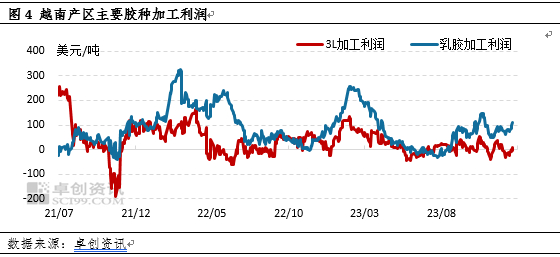 从越南产区加工利润来看,由于今年越南产区开割初期干旱,虽然随后雨季旱情缓解,但原料胶水释放不畅,从而使得原料胶水收购价格持续坚挺270-280越南盾/度水平,加工厂生产成本居高不下,越南3L/混合及乳胶加工利润总体缺乏。但随着新胶的逐步放量,越南胶生产盈利局面相对乐观,加工厂积极抢购推高原料价格,原料收购价格涨至295-315越南盾/度,3L生产利润空间收缩,浓乳生产加工利润继续保持,刺激加工厂对于浓乳胶生产积极性,因此使得国内越南3L混合到港压力相对有限,国内累库节奏滞缓。