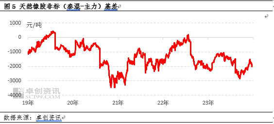 从近五年天然橡胶非标基差统计来看,2023年基差波动率明显收窄,给予套利盘可操作空间减少。从2023年天然橡胶期现非标(人混-沪胶主力合约)基差变化来看,整体波动基本处于1000-3000元/吨之间,波动较往年同期明显偏弱,从而导致套利盘可操作性机会减少,套利利润缺乏,套利氛围整体下降;此外年内人民币汇率变化令进口成本不断抬升;同时下半年开始国内港口一般贸易库库存持续去化,从而对现货市场支撑较为明显,因此令期现非标基差回归不及往年顺畅。