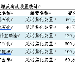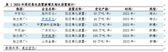 2023年主要是广东石化新投产2套300万吨/年延迟焦化装置,宁夏瑞科宝瑞隆新投产120万吨/年延迟焦化装置、科宇100万吨/年延迟焦化装置、山东金泰60万吨/年延迟焦化装置,与此同时,个别炼厂延迟焦化装置延续淘汰步伐,胜利石化50万吨/年焦化装置淘汰,齐成40万吨/年焦化装置淘汰。