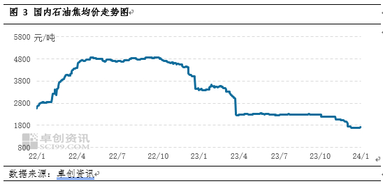 2023年来看,今年石油焦市场呈现震荡下行态势。2023年1-12月国内石油焦均价为2482.89元/吨,较2022年同期下跌1865元/吨或75.11%。最高价出现在2月中旬前后,最高价为3627元/吨,最低价出现在12月,最低日均价为1683元/吨左右,价格最大波幅度为1938元/吨。具体来看,2023年上半年石油焦市场先稳后跌,整体震荡下行,年初价格短暂平稳后,3月底呈现下跌局面。港口库存高位,下游观望情绪愈发浓厚等供过于求的基本面使石油焦市场承压运行。下半年开始,三季度在供应端炼厂检修到复产变化指引下,市场价格重心上移后回落,下游业者刚需采购是主要支撑因素。四季度,由于冬季装置运行,炼厂提高开工负荷,石油焦产量呈现增加趋势,并且下游对原料库存保持合理控制,对石油焦需求量依旧维持刚需为主,在供需面压力仍存局面下,整体四季度国内石油焦市场行情仍然疲软运行,12月下旬开始走出触底反弹趋势。