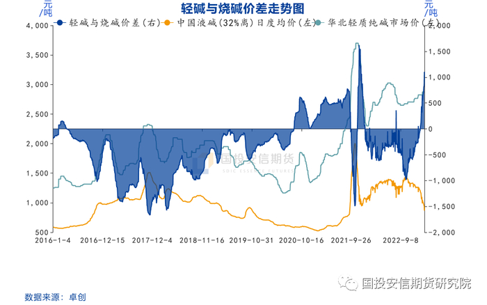 一般用1.325*轻碱-32%液碱的折百价去看两者价差。从价差历史走势看,大部分区间位于-1000- 500元/吨。2021年之前,价差多为负值,2021年之后,随着光伏的大量投产带动重碱消耗增加,重碱价格快速拉升带动轻碱上涨,使得轻碱涨幅高于烧碱,价差抬升,行业整体格局有一定转变,轻碱的价格走势优于烧碱,一方面是纯碱上市后,会出现一些非标套的情况,对轻碱的需求拉动增加,另外光伏和碳酸锂的新能源概念,重碱需求大增,企业调高重质生产比例,相应下调轻质生产比例,最后带来轻碱供需格局好于烧碱,两者价差扩大。近期我们看到烧碱价格持续回落,纯碱库存低,价格坚挺,轻碱与烧碱价差持续扩大,出现一些下游选择烧碱替代轻碱,对轻碱消费形成拖累,价格出现阴跌。