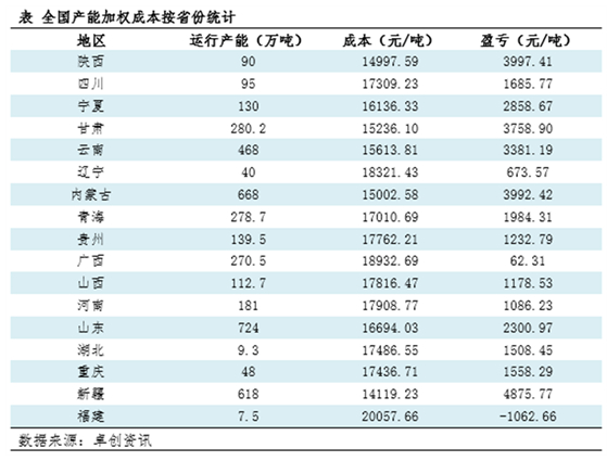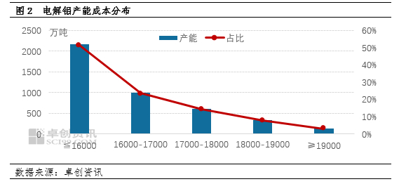 据卓创资讯统计,本期全国电解铝亏损产能占比较上期小幅调整。据卓创资讯统计,本期电解铝产能成本在16000元/吨以下的产能规模为2100万吨,占比50.48%;16000-17000元/吨产能规模为1089.2万吨,占比26.18%;17000-18000元/吨产能规模为517.5万吨,占比14.43%;18000-19000元/吨产能规模为326.2万吨,占比7.84%;产能成本大于19000元/吨的产能规模127.5万吨,占比3.06%。