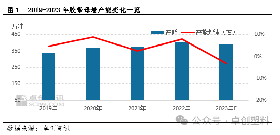 据卓创资讯统计数据显示,2019-2023年中国胶带母卷产能先增后降,近五年产能增速在-3.29%到8.87%。2023年中国胶带母卷总产能为392.44万吨,较2022年减少13.34万吨,较2019年增加55.22万吨;行业供应过剩,竞争加剧,年内新增产能增速放缓,且淘汰落后产能速度加快。