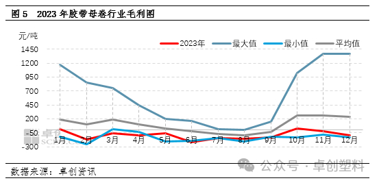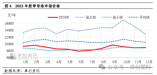 2023年胶带母卷市场供需差处于五年高位,对胶带母卷高价持续施压,且上半年原料价格下行对胶带母卷支撑减弱,加深胶带母卷下行空间,故在6月跌破历时五年同期低位。年内均价高价出现在9月,主因经过上半年连续下行,下游补货量降低,库存减少,到三季度传统旺季,市场需求增加,其次成本上涨,再次带动市场投机需求增加,在需求及成本双重支撑下,三季度价格上扬;4季度随着成本及需求利好减弱,价格震荡下跌。