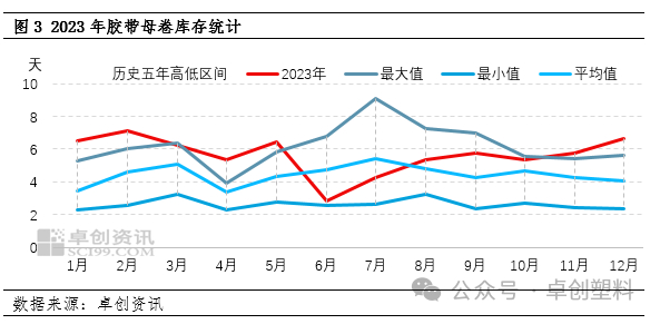 2023年库存运行范围在2.85-7.11天;多个月胶带母卷生产企业库存高于历史五年同期最高水平,6月企业控库,下半年库存在历史五年同期平均水平附近震荡。年内最高库存出现在2月,库存累积至7.11天,低库存在6月为2.85天。