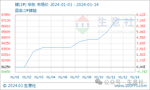 锑01月14日最新价格87250.00元/吨,最近15天上涨7.38%。