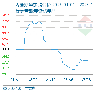 据生意社商品行情分析系统,2023年1月1日丙烯酸华东地区均价为6800元/吨,12月31日均价为6187.50元/吨,年内行情下跌9.01%。全年价格最低点为11月3日的5825元/吨,价格最高点为2月13日的8200元/吨,最大振幅为40.77%。