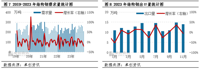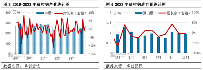 2023年结构钢供应端(产量+进口)变化不大,卓创资讯监测的数据来看,2023年结构钢产量在3004.77万吨,同比增加0.79%。2023年1-11月结构钢进口量在10.32万吨,预估2023年全年结构钢进口量在11.22万吨,同比减少69.58%。2023年结构钢供应端(产量+进口)总量在3015.99万吨,环比减少0.07%。一方面,2023年结构钢生产亏损加剧,企业生产积极性有所下降,但由于螺纹钢产能转产带来的影响,结构钢产量略有增大;另一方面,受到国内需求减弱的影响,结构钢进口量下滑明显,但由于近年进口基数较小的原因,整体进口减量与国内产量的增量基本相同。