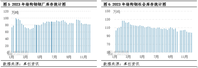 从库存结构来看,2023年结构钢企业库存呈现先降后涨再下降的趋势,贸易商社会库存呈现先涨后降的趋势。截至2023年12月29日,卓创资讯数据监测的中国29家结构钢生产企业库存总量为81.21万吨,较2022年12月末增加13.09万吨,增幅19.22%,年内高点位于1月下旬的99.49万吨。社会库存方面统计山东、河北、江浙区域66家贸易企业库存总量为94.86万吨,较2022年12月末下降8.09万吨,降幅7.86%,年内高点位于2月上旬的126.9万吨。