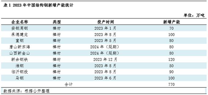 2023年中国结构钢产能上涨的脚步加快,具备良好的发展前景,主要是在国家政策上的倾斜、地产市场不景气下螺纹钢需求偏弱,同时结构钢整体利润好于螺纹钢等多重因素作用下,钢厂生产结构钢的积极性明显提升,如周钢等部分之前一直生产螺纹钢的企业,在综合衡量结构钢与螺纹钢的成本利润、销售情况等方面试水新领域的转型之举。淘汰产能方面,有西王特钢90万吨产能,与螺纹钢一同混产的小棒线因企业自身经营原因,退出历史舞台,大棒线目前产能依旧存在。苏钢2022年11月招标拆除,2023年样本产能删除。