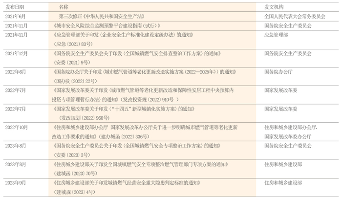 以严进、严管、重罚为特点的城镇燃气安全监管机制正在建立。2021年以来的几起重特大燃气安全事故使得燃气安全受到空前关注。国务院、国务院安全生产委员会、应急管理部、国家发展改革委等多部门发文(见表1),对全国城镇燃气安全风险隐患开展全链条排查与专项整治,制定了包括老化管网和设施更新改造、燃气安全监管智能化建设、完善管理制度和法规标准等具体措施与分阶段目标,着力加强城镇燃气安全风险管控和隐患排查治理,遏制城镇燃气领域安全事故多发态势。
