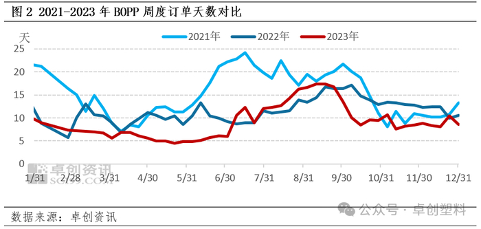 四季度需求转淡,由于终端需求传导不畅,BOPP下游多消耗前期备货,仅在原料短暂上涨刺激下入市集中采购,其余时候延续刚需采购模式,订单周期较三季度缩短,对BOPP支撑力度减弱。据卓创资讯调研的20家BOPP生产企业的未交付订单天数来看:四季度平均订单天数在9.3天,较二季度缩短4天左右,截至12月29日,企业订单周期在8.6天,较10月初缩短5天左右。四季度企业未交付订单天数多在15天以内,多数时间处于一周附近,订单处于年内中低位水平,拖累BOPP下行。
