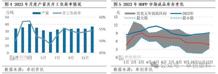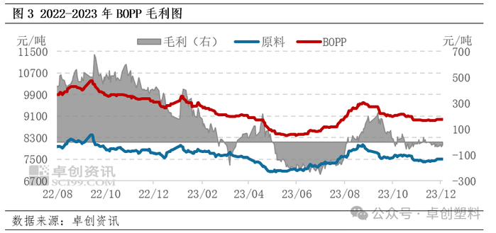 需求看,2023年12月已释放部分订单,2024年1月年单释放或有限,2月春节假期期间,下游部分时段处于停产阶段,新单跟进不足,进入3月,下游逐渐复工,新单成交或有好转。考虑当前终端需求传导不畅,BOPP下游心态相对谨慎,采购以满足刚需为主,因此预计2024年一季度市场需求释放有限,对市场支撑力度减弱。