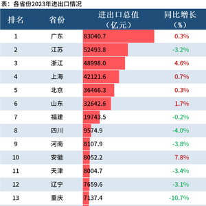 Mysteel:31省份2023年进出口排行榜出炉,粤浙贸易顺差超2万亿元