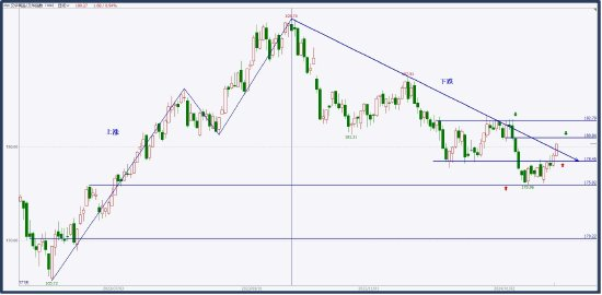 商品指数自走出193的高点后,进入持续的下跌趋势,波浪式下跌将市场的重心持续下移。当下指数在178受到支撑后,短暂反弹,受到下降趋势线和左侧局部压力182共振压制后,走出连续的阴线,呈现出新的下跌趋势行情。当下指数在176至178之间震荡,并反弹向上盘整。