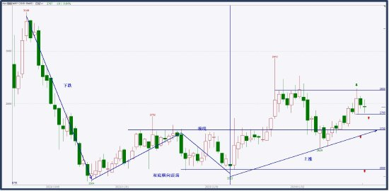 烧碱自上市以来,走出强势的下跌行情,最终在2500附近开始横向震荡,在二次测试2500后,展开新的上涨趋势段,并顺利突破双底颈线2700。上涨趋势段,在冲击2900之后,回落测试颈线。