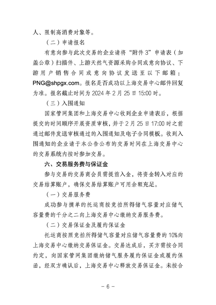 国家管网集团和上海交易中心收到企业申请表后,根据提交的时间顺序开展资质审核,并于2月25日17:00时之前通过邮件发送审核通过的入围通知及电子合同模板。收到入围通知的企业请于本公告公布的交易时间在上海交易中心的交易系统内按时参加交易。