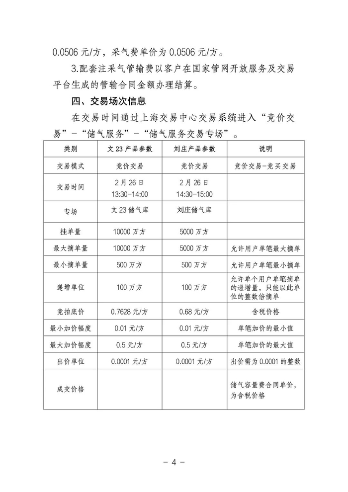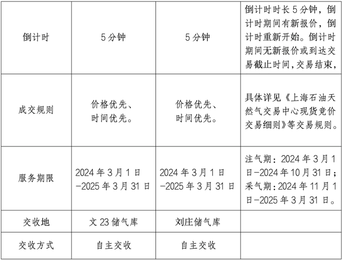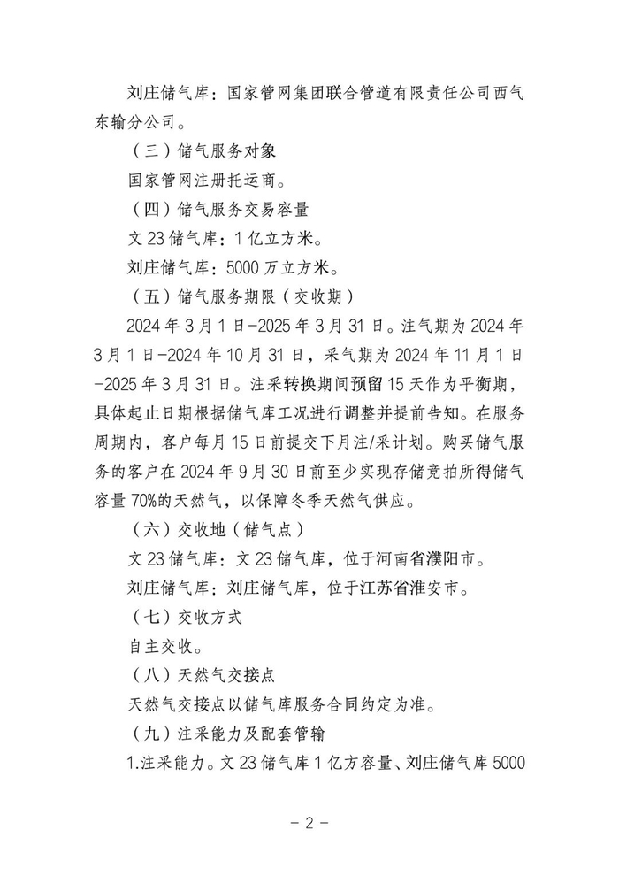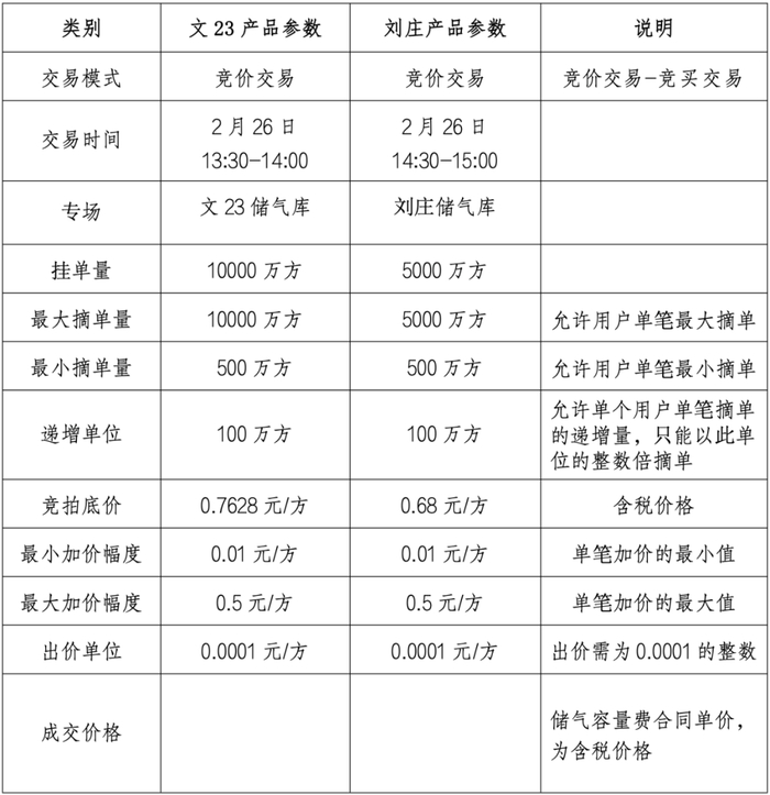 国家石油天然气管网集团(简称“国家管网集团”)联合上海石油天然气交易中心(简称“上海交易中心”)拟定于2024年2月26日通过上海交易中心交易平台开展国家管网集团文23储气库和刘庄储气库储气容量竞价交易。具体公告如下: