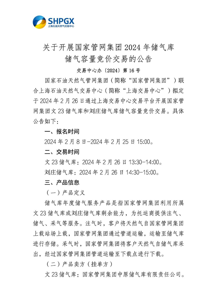 SHPGX导读:国家石油天然气管网集团联合上海石油天然气交易中心拟定于2024年2月26日通过上海交易中心交易平台开展国家管网集团文23储气库和刘庄储气库储气容量竞价交易。具体公告如下。