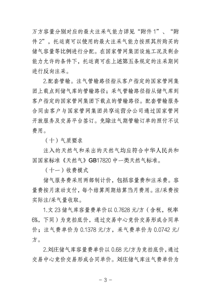 1.文23储气库容量费单价以0.7628元/方(含税,税率6%,下同)为竞拍底价,通过交易中心竞价交易形成合同单价;注气费单价为0.1378元/方,采气费单价为0.0742元/方。