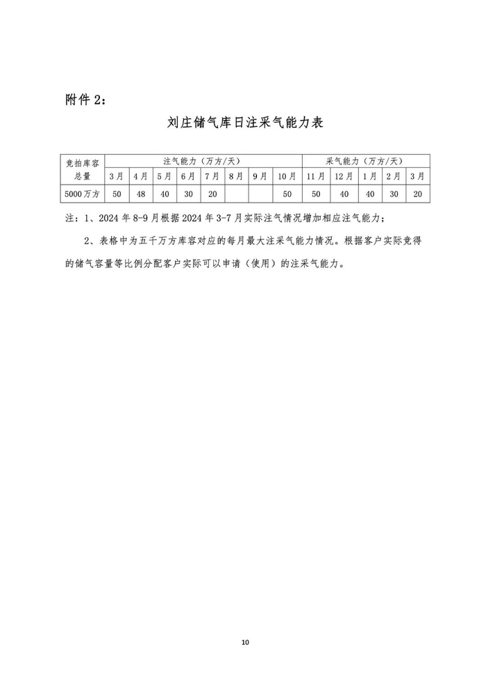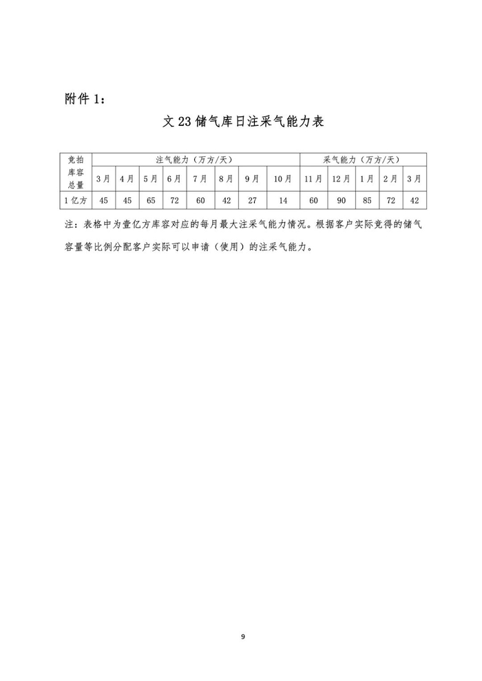 1.注采能力。文23储气库1亿方容量、刘庄储气库5000万方容量分别对应的最大注采气能力详见“附件1”、“附件2”,托运商可以使用的最大注采气能力按照其所购买的储气容量等比例进行分配。在国家管网集团设施工况及剩余能力允许的条件下,托运商可在上述第五条规定的注采期间进行反向注采。