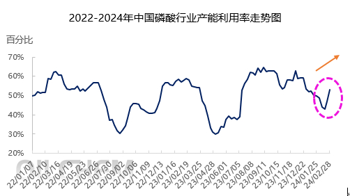 截止2月最后一周,国内磷酸一铵周度行业产能利用率 52.97%,环比提升 6.11%,较去年同期相比低1.79%。春节假期过后,部分节前停产装置陆续重启,另外部分减产装置提高开工负荷,整体供应量逐步增加。而近期,随着出口消息面的明确,整体市场气氛及情绪面将会受到带动,加之社会库存、终端库存低位,炒涨气氛或将持续一段时间,那么也将继续推动磷酸一铵行业产能利用率的提升。
