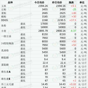 12日DDGS价格上涨。绥化1980松原2150涨50四平2250涨50邢台2280涨50潍坊2300涨50商丘2250孟州2300涨50蚌埠2330涨50。