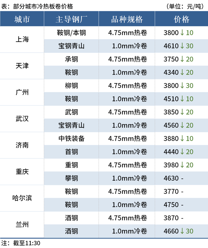 ◎武汉:14日早盘冷轧市场价格跌20,1.0宝钢青山卷4560,1.5卷4530,3.0卷4960。(单位:元/吨)