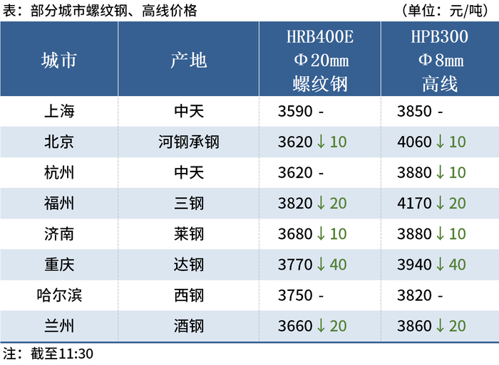 ◎北京:14日早盘建材市场价格跌10,现河钢、敬业HRB400E螺纹Ф12mm3680、Ф20mm3620,HRB400E盘螺Ф10mm3900。(单位:元/吨)