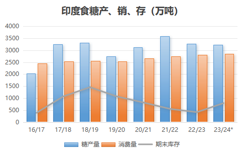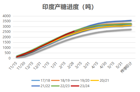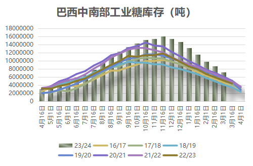 截至2月28日巴西中南部糖及糖蜜工业库存为725万吨,同比增加210万吨,亦比20/21榨季同期的前记录高位增加115万吨,其中原糖库存422万吨,同比增加195万吨。但自去年12月以来巴西糖厂去库存进度持续加快,市场对巴西的关注点从高库存压力彻底转向24/25榨季的产量前景。