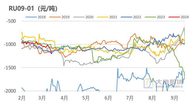 3月14日RU09-01月差为-1190元/吨,较上周下跌135元/吨。