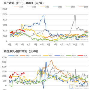 下游对于浓乳的接受程度不高。从下游来看对高价浓乳的接受程度不高,所以浓乳的持续性必须要看供应端是否会出问题。如果供应端开割顺利、产出正常,则浓乳价格在一个月之后下跌的可能性也比较大,那么对RU的支撑也就随之消失,盘面继续走上深浅色回归逻辑的可能性较大。