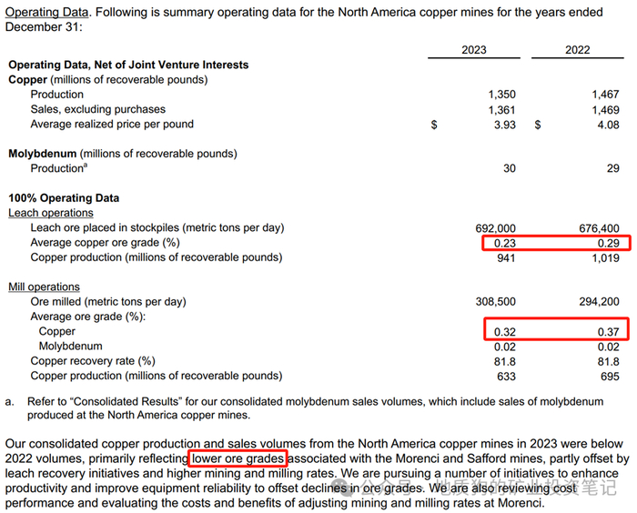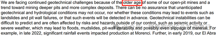 (1) Morenci和Safford:品位下降,并且2022年底,重大降雨事件影响了Morenci的生产,在公司的解释中,明确指出根本原因是矿山老龄化。