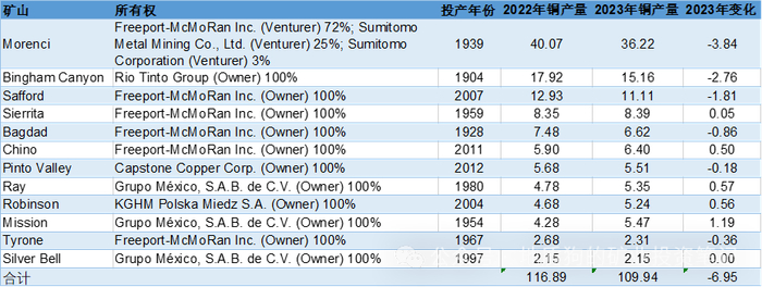 其中可以看到,三个最大的项目:Morenci、Bingham Canyon、Safford是最大减量,分别减少3.8万吨、2.8万吨、以及1.8万吨,三者合计减量8.4万吨,基本上就解释2023年美国铜产量下降的主要来源。