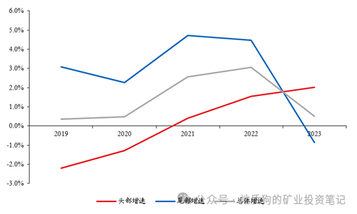 (7)本文统计了头部11家铜矿企业近年来的产量并与全球总产量进行比较,除这11家以外的矿企称为尾部矿企。数据显示2019年到2022年,尾部矿企的增速都是明显高于头部矿企的,但是到了2023年,尾部矿企的增速却成了拖累项:-0.9%。