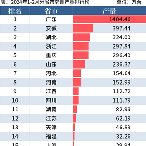 从分省市数据来看,2024年1-2月广东以产量1404.46万台位列第一;安徽产量397.44万台排在第二;湖北产量324.00万台排在第三。