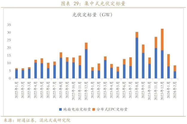 结合以上分析,2024年分布式光伏新增预计可达120GW,同比增长达25%。从分布式光伏EPC的招标定标数据来看,2024年1-2月,分布式光伏定标量合计11.9GW,同比增75%。抛开春节过节导致的定标数据环比有所下滑,随着光伏组件价格的下滑,经济收益凸显的同时,定标规模也在不断的扩大,也为今年分布式光伏的高增速提供了数据支撑。