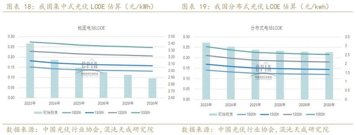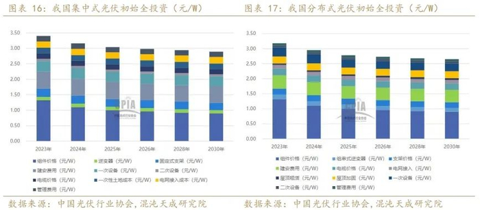 我国地面光伏系统的初始全投资主要由组件、逆变器、支架、电缆、一次设备、二次设备等关键设备成本,以及土地费用、电网接入、建安、管理费用等部分构成。2023年,我国地面光伏系统的初始全投资成本为 3.4元/W左右,其中组件约占投资成本的38.8%。随着组件新增产能不断释放,组件价格预计低位运行,叠加组件光电转换效率稳步提升,整体系统造价将稳步降低,集中式光伏系统初始全投资成本可下降至3.16元/W左右。分布式光伏主要由设备成本构成,2023年我国工商业分布式光伏系统初始投资成本为3.18元/W,2024年预计下降至3元/W以下。成本进一步下行。