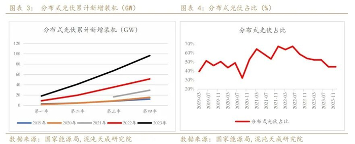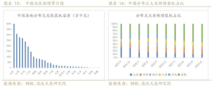 我们关注到,2023年光伏行业暴露出传统分布式光伏大省消纳能力不足的问题,各地纷纷出台了相关的管理措施,放缓分布式光伏备案及并网工作。山东、河南、浙江、江苏和河北是我国分布式光伏装机容量前五的省份,我们从分布式新增装机占比的变化可以发现,前五大省的新增装机占比在逐季下滑,中部省份如安徽、江西在成为新的增量市场。但从2023年四季度新增分布式光伏的数据来看,环比三季度仍有11.3%的增速,前五大省份新增装机占比的下降也在放缓,2024年分布式光伏仍有较大增长空间。