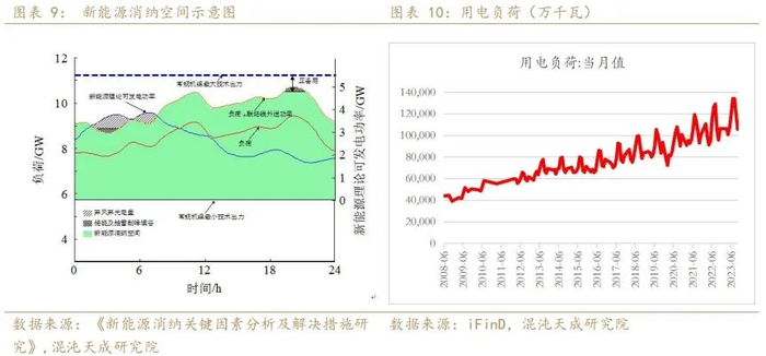 由于风、光的资源特性,新能源出力存在随机性和波动性。风电日波动最大幅度可达装机容量的80%,且呈现一定的反调峰特性,随着新能源高比例接入电力系统后,增加了系统调节的负担,出现新能源消纳问题。业内一般通过净负荷曲线(负荷-新能源出力)观察消纳空间,净负荷曲线最低点与常规电源最小技术出力的差值决定剩余消纳空间。所以用电需求的增长、火电最小技术出力的下修、抽水蓄能、配储能、特高压输电都可以提升新能源的消纳能力。