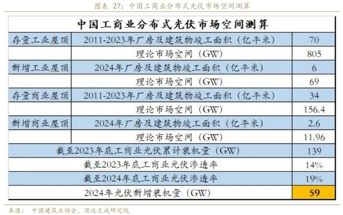 根据中国建筑业协会公布的报告,截至2023年底,我国存量工业、商业竣工面积分别为69.7亿平和34.1亿平,2023年分别增7和2.6亿平方米。按照工业屋顶面积等于竣工面积的50%,商业屋顶面积等于竣工面积的20%测算,预计国内工商业分布式光伏市场潜力在950GW,截至2023年年底渗透率仅为14%。根据整县推进政策要求,到2025年党政机关建筑、公共建筑、工商业厂房、农村居民屋顶总面积安装光伏发电比例分别不低于50%、40%、30%和20%。按照2024年渗透率达到19%,中国工商业分布式光伏新增装机规模预计在59GW。